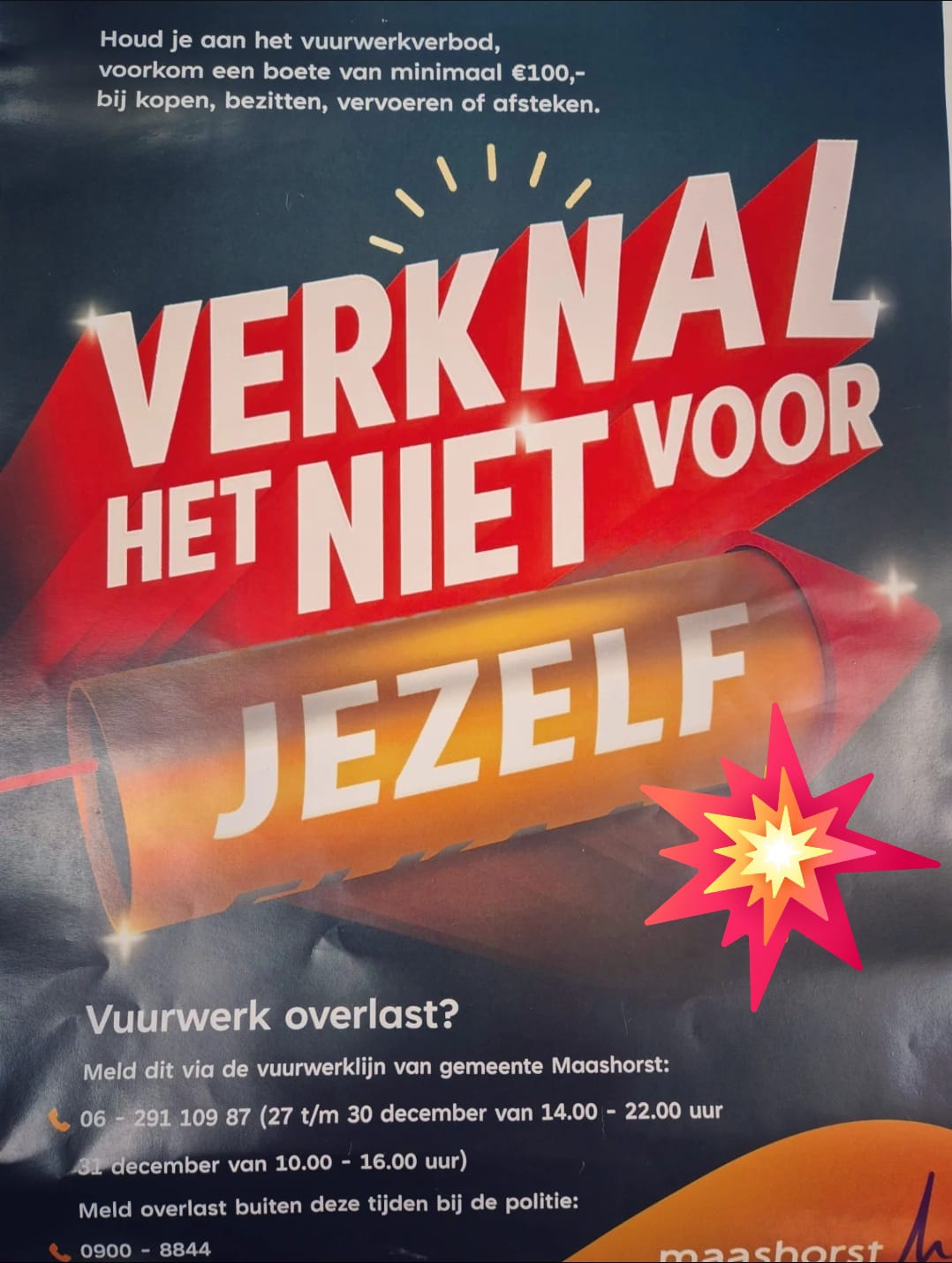 De verkoop en het afsteken van vuurwerk is net als vorig jaar verboden in het hele land. Het verbod geldt niet voor fop- en schertsvuurwerk (categorie F1), zoals trektouwtjes, knalerwten en sterretjes. Zo zorgen we er samen voor dat we de zorg niet extra belasten voor, tijdens en na oud en nieuw. Politie en boa’s handhaven de vuurwerkregels. Het is ook verboden in het buitenland gekocht oudejaarsvuurwerk naar Nederland te vervoeren.